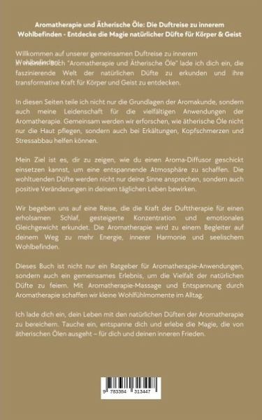 Aromatherapie und Ätherische Öle: Die Duftreise zu innerem Wohlbefinden - Entdecke die Magie natürlicher Düfte für Körper und GeistWillkommen auf unserer gemeinsamen Duftreise zu innerem Wohlbefinden! In meinem Buch "Aromatherapie und Ätherische Öle" lade ich dich ein, die faszinierende Welt der natürlichen Düfte zu erkunden und ihre transformative Kraft für Körper und Geist zu entdecken.In diesen Seiten teile ich nicht nur die Grundlagen der Aromakunde, sondern auch meine Leidenschaft für die vielfältigen Anwendungen der Aromatherapie. Gemeinsam werden wir erforschen, wie ätherische Öle nicht nur die Haut pflegen, sondern auch bei Erkältungen, Kopfschmerzen und Stressabbau helfen können.Mein Ziel ist es, dir zu zeigen, wie du einen Aroma-Diffusor geschickt einsetzen kannst, um eine entspannende Atmosphäre zu schaffen. Die wohltuenden Düfte werden nicht nur deine Sinne ansprechen, sondern auch positive Veränderungen in deinem täglichen Leben bewirken.Wir begeben uns auf eine Reise, die die Kraft der Dufttherapie für einen erholsamen Schlaf, gesteigerte Konzentration und emotionales Gleichgewicht erkundet. Die Aromatherapie wird zu einem Begleiter auf deinem Weg zu mehr Energie, innerer Harmonie und seelischem Wohlbefinden.Dieses Buch ist nicht nur ein Ratgeber für Aromatherapie-Anwendungen, sondern auch ein gemeinsames Erlebnis, um die Vielfalt der natürlichen Düfte zu feiern. Mit Aromatherapie-Massage und Entspannung durch Aromatherapie schaffen wir kleine Wohlfühlmomente im Alltag.Ich lade dich ein, dein Leben mit den natürlichen Düften der Aromatherapie zu bereichern. Tauche ein, entspanne dich und erlebe die Magie, die von ätherischen Ölen ausgeht - für dich und deinen inneren Frieden.
