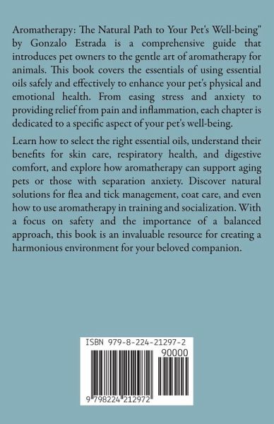 Aromatherapy: The Natural Path to Your Pet's Well-being" by Gonzalo Estrada is a comprehensive guide that introduces pet owners to the gentle art of aromatherapy for animals. This book covers the essentials of using essential oils safely and effectively to enhance your pet's physical and emotional health. From easing stress and anxiety to providing relief from pain and inflammation, each chapter is dedicated to a specific aspect of your pet's well-being. Learn how to select the right essential oils, understand their benefits for skin care, respiratory health, and digestive comfort, and explore how aromatherapy can support aging pets or those with separation anxiety. Discover natural solutions for flea and tick management, coat care, and even how to use aromatherapy in training and socialization. With a focus on safety and the importance of a balanced approach, this book is an invaluable resource for creating a harmonious environment for your beloved companion.