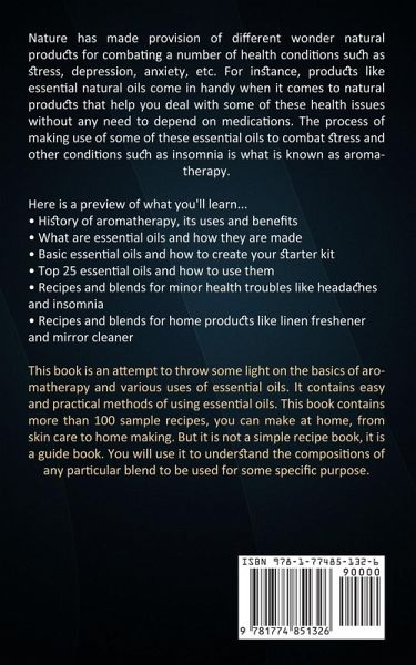 Nature has made provision of different wonder natural products for combating a number of health conditions such as stress, depression, anxiety, etc. For instance, products like essential natural oils come in handy when it comes to natural products that help you deal with some of these health issues without any need to depend on medications. The process of making use of some of these essential oils to combat stress and other conditions such as insomnia is what is known as aromatherapy. Here is a preview of what you'll learn... ¿ History of aromatherapy, its uses and benefits ¿ What are essential oils and how they are made ¿ Basic essential oils and how to create your starter kit ¿ Top 25 essential oils and how to use them ¿ Recipes and blends for minor health troubles like headaches and insomnia ¿ Recipes and blends for home products like linen freshener and mirror cleaner This book is an attempt to throw some light on the basics of aromatherapy and various uses of essential oils. It contains easy and practical methods of using essential oils. This book contains more than 100 sample recipes, you can make at home, from skin care to home making. But it is not a simple recipe book, it is a guide book. You will use it to understand the compositions of any particular blend to be used for some specific purpose.