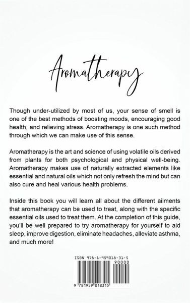 AROMATHERAPY Though under-utilized by most of us, your sense of smell is one of the best methods of boosting moods, encouraging good health, and relieving stress. Aromatherapy is one such method through which we can make use of this sense. Aromatherapy is the art and science of using volatile oils derived from plants for both psychological and physical well-being. Aromatherapy makes use of naturally extracted elements like essential and natural oils which not only refresh the mind but can also cure and heal various health problems. Inside this book, you will learn all about the different ailments that aromatherapy can be used to treat, along with the specific essential oils used to treat them. At the completion of this guide, you'll be well prepared to try aromatherapy for yourself to aid sleep, improve digestion, eliminate headaches, alleviate asthma, and much more! Ready to experience the power of Aromatherapy for yourself? Scroll up and hit "Buy Now" to get started today!