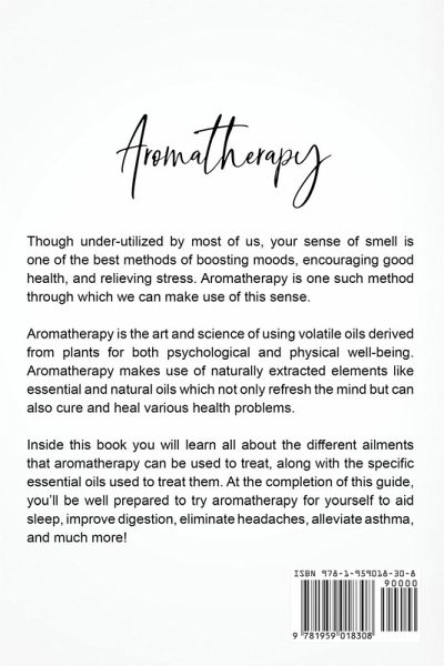 AROMATHERAPY Though under-utilized by most of us, your sense of smell is one of the best methods of boosting moods, encouraging good health, and relieving stress. Aromatherapy is one such method through which we can make use of this sense. Aromatherapy is the art and science of using volatile oils derived from plants for both psychological and physical well-being. Aromatherapy makes use of naturally extracted elements like essential and natural oils which not only refresh the mind but can also cure and heal various health problems. Inside this book, you will learn all about the different ailments that aromatherapy can be used to treat, along with the specific essential oils used to treat them. At the completion of this guide, you'll be well prepared to try aromatherapy for yourself to aid sleep, improve digestion, eliminate headaches, alleviate asthma, and much more! Ready to experience the power of Aromatherapy for yourself? Scroll up and hit "Buy Now" to get started today!
