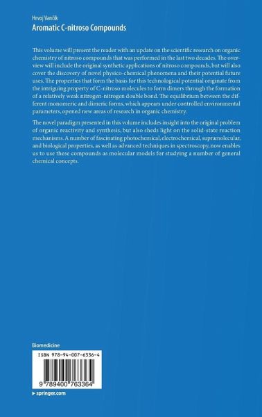 This book is designed to collect and review the research covering main directions in investigations of aromatic nitroso compounds in last decades, and to present both, the academic aspects of this chemistry, as well as the open field of its applicability. The book is divided in five chapters. The basic structural properties of the nitroso aromatic molecules are described in the first chapter. The second chapter is an overview of the methods of preparations of aromatic nitroso and polynitroso compounds, including classical synthetic methods and some new preparative approaches. The third part deals with the physico-chemical properties of nitroso aromates and azodioxides, its structure, crystallography, quantum chemical calculations, spectroscopy, typical reactions, and especially it is focused on the dimerizations in the solid-state. In the fourth chapter is represented organometallic chemistry of nitroso aromatic molecules and its applications in catalysis. The last part of the book deals with the behavior of this class of compounds in the biological systems, reactions with biomolecules and the use in toxicology.