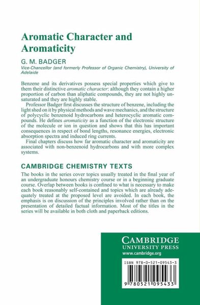 Originally published in 1969, this book analyses the special properties of benzene and its derivatives, which give them their distinct aromatic character. The text first discusses the structure of benzene, including the light shed on it by physical methods and wave mechanics, and the structure of polycyclic benzenoid hydrocarbons and heterocyclic aromatic compounds. Aromaticity is defined as a function of the electronic structure of the molecule or ion in question and it is shown that this has important consequences in respect of bond lengths, resonance energies, electronic absorption spectra and induced ring currents. Final chapters discuss how far aromatic character and aromaticity are associated with non-benzenoid hydrocarbons and with more complex systems.