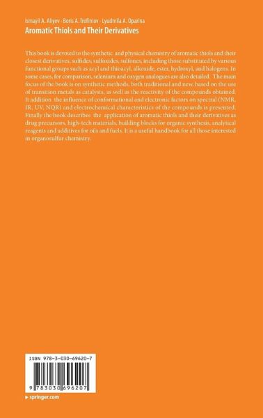 This book is devoted to the synthetic and physical chemistry of aromatic thiols and their closest derivatives, sulfides, sulfoxides, sulfones, including those substituted by various functional groups such as acyl and thioacyl, alkoxide, ester, hydroxyl and halogens. In some cases, for comparison, selenium and oxygen analogues are also detailed. The main focus of the book is on synthetic methods, both traditional and new, based on the use of transition metals as catalysts, as well as the reactivity of the compounds obtained. Its addition to the influence of conformational and electronic factors on spectral (NMR, IR, UV, NQR) and electrochemical characteristics of the compounds is presented. Finally, the book describes the application of aromatic thiols and their derivatives as drug precursors, high-tech materials, building blocks for organic synthesis, analytical reagents and additives for oils and fuels. It is a useful handbook for all those interested in organosulfur chemistry.