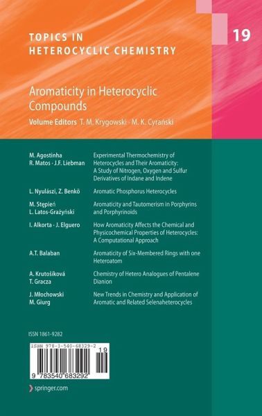 Heterocyclic chemistry is the biggest branch of chemistry covering two-thirds of the chemical literature. Aromaticity in Heterocyclic Compounds covers hot topics of frontier research summarized by reputed scientists in the field.