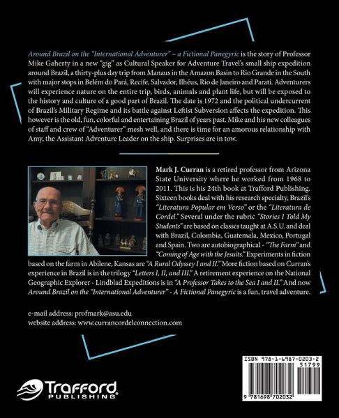 Around Brazil on the "International Adventurer" - a Fictional Panegyric is the story of Professor Mike Gaherty in a new "gig" as Cultural Speaker for Adventure Travel's small ship expedition around Brazil, a thirty-plus day trip from Manaus in the Amazon Basin to Rio Grande in the South with major stops in Belém do Pará, Recife, Salvador, Ilhéus, Rio de Janeiro and Parati. Adventurers will experience nature on the entire trip, birds, animals and plant life, but will be exposed to the history and culture of a good part of Brazil. The date is 1972 and the political undercurrent of Brazil's Military Regime and its battle against Leftist Subversion affects the expedition. This however is the old, fun, colorful and entertaining Brazil of years past. Mike and his new colleagues of staff and crew of "Adventurer" mesh well, and there is time for an amorous relationship with Amy, the Assistant Adventure Leader on the ship. Surprises are in tow.