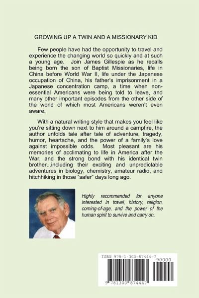 Few people have had the opportunity to travel and experience the changing world so quickly and at such a young age. Join James Gillespie as he recalls being born the son of Baptist Missionaries, life in China before World War II, life under the Japanese occupation of China, his father's imprisonment in a Japanese concentration camp, a time when non-essential Americans were being told to leave, and many other important episodes from the other side of the world of which most Americans weren't even aware. With a natural writing style that makes you feel like you're sitting down next to him around a campfire, the author unfolds tale after tale of adventure, tragedy, humor, heartache and the power of a family's love against impossible odds. Most pleasant are his memories of acclimating to life in America after the war, and the strong bond with his identical twin brother...including their exciting and unpredictable adventures in biology, chemistry, amateur radio, and hitchhiking in those "safer" days long ago.