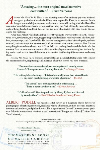 The New York Times Best Seller "Amazing . . . the most original travel narrative ever written." -CounterPunch Around the World in 50 Years is the inspiring story of an ordinary guy who achieved two great goals that others had told him were impossible. First, he set a record for the longest automobile journey ever made around the world, during which he blasted his way out of minefields, survived a serious accident atop the Peak of Death, came within seconds of being lynched, and lost three of the five men who started with him: two to disease, one to the Vietcong. After that, Albert Podell set another record by going to every country on earth. He survived riots, revolutions, civil wars, trigger-happy child soldiers, voodoo priests, jihadists, robbers, corrupt cops, and Cape buffalo. He traveled through every kind of earthquake, cyclone, tsunami, volcanic eruption, snowstorm, and sandstorm that nature threw at him. He ate everything from old camel meat and African field rats to dung beetles and the brain of a live monkey. And he overcame encounters with crocodiles, hippos, anacondas, giant leeches, flying crabs-and several beautiful women who insisted that he stop this nonsense and marry them. Around the World in 50 Years is a remarkable and meaningful tale packed with some of the most memorable, frightening, and hilarious adventure stories you have ever read.