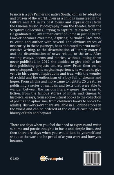 Francis is a guy Primerano native South, Roman by adoption and citizen of the world. Even as a child is immersed in the Culture and Art in its best forms and expressions (from the Cinema Music, Photography from the theater, from the Scripture Collectibles), trying to capture its essence better. He graduated in Law at "Sapienza" of Rome in just 23 years. Lawyer becomes over time, Aspiring Journalist, Face cine-tv, critic and author with several and obvious traces of insecurity. In these journeys, he is dedicated to print media, creative writing, to the dissemination of literary material and the dissemination of news related to the arts. After writing essays, poems and stories, without letting them never published, in 2012 she decided to give birth to her first publishing projects entirely new. From then on he never stopped. In this magical experience, he wanted to give vent to his deepest inspirations and true, with the wonder of a child and the enthusiasm of a boy full of dreams and hopes. From all this and more came to light its 25 creatures publishing a series of manuals and texts that were able to wander between the various literary genre (the essay to fiction, from the famous stories of music and cinema to historical essays, from socio-cultural books to the collection of poems and aphorisms, from children's books to books for adults).