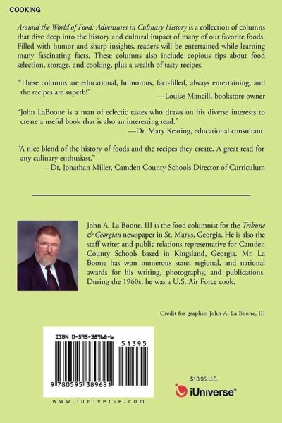 Around the World of Food: Adventures in Culinary History is a collection of columns that dive deep into the history and cultural impact of many of our favorite foods. Filled with humor and sharp insights, readers will be entertained while learning many fascinating facts. These columns also include copious tips about food selection, storage, and cooking, plus a wealth of tasty recipes. "These columns are educational, humorous, fact-filled, always entertaining, and the recipes are superb!" Louise Mancill, bookstore owner "John LaBoone is a man of eclectic tastes who draws on his diverse interests to create a useful book that is also an interesting read." Dr. Mary Keating, educational consultant. "A nice blend of the history of foods and the recipes they create. A great read for any culinary enthusiast." Dr. Jonathan Miller, Camden County Schools Director of Curriculum