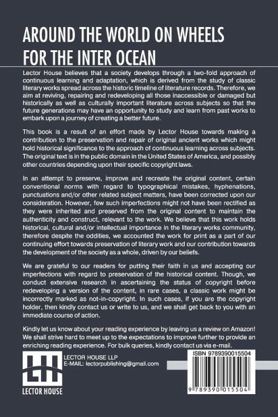 Around The World On Wheels For The Inter Ocean This book is a result of an effort made by us towards making a contribution to the preservation and repair of original classic literature. In an attempt to preserve, improve and recreate the original content, we have worked towards: 1. Type-setting & Reformatting: The complete work has been re-designed via professional layout, formatting and type-setting tools to re-create the same edition with rich typography, graphics, high quality images, and table elements, giving our readers the feel of holding a 'fresh and newly' reprinted and/or revised edition, as opposed to other scanned & printed (Optical Character Recognition - OCR) reproductions. 2. Correction of imperfections: As the work was re-created from the scratch, therefore, it was vetted to rectify certain conventional norms with regard to typographical mistakes, hyphenations, punctuations, blurred images, missing content/pages, and/or other related subject matters, upon our consideration. Every attempt was made to rectify the imperfections related to omitted constructs in the original edition via other references. However, a few of such imperfections which could not be rectified due to intentional\unintentional omission of content in the original edition, were inherited and preserved from the original work to maintain the authenticity and construct, relevant to the work. We believe that this work holds historical, cultural and/or intellectual importance in the literary works community, therefore despite the oddities, we accounted the work for print as a part of our continuing effort towards preservation of literary work and our contribution towards the development of the society as a whole, driven by our beliefs. We are grateful to our readers for putting their faith in us and accepting our imperfections with regard to preservation of the historical content. HAPPY READING!