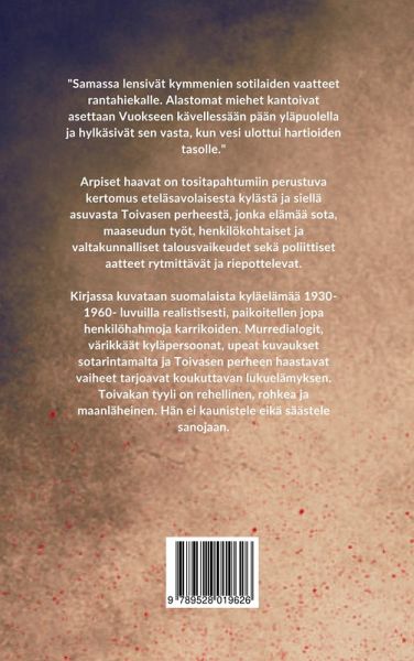 "Samassa lensivät kymmenien sotilaiden vaatteet rantahiekalle. Alastomat miehet kantoivat Vuokseen kävellessään asettaan pään yläpuolella ja hylkäsivät sen vasta, kun vesi ulottui hartioiden tasolle." Arpiset haavat on tositapahtumiin perustuva kertomus eteläsavolaisesta kylästä ja siellä asuvasta Toivasen perheestä, jonka elämää sota, maaseudun työt, henkilökohtaiset ja valtakunnalliset talousvaikeudet sekä poliittiset aatteet rytmittävät ja riepottelevat. Kirjassa kuvataan suomalaista kyläelämää 1930-1960- luvuilla realistisesti, paikoitellen jopa henkilöhahmoja karrikoiden. Murredialogit, värikkäät kyläpersoonat, upeat kuvaukset sotarintamalta ja Toivasen perheen haastavat vaiheet tarjoavat koukuttavan lukuelämyksen. Toivakan tyyli on rehellinen, rohkea ja maanläheinen. Hän ei kaunistele eikä säästele sanojaan.