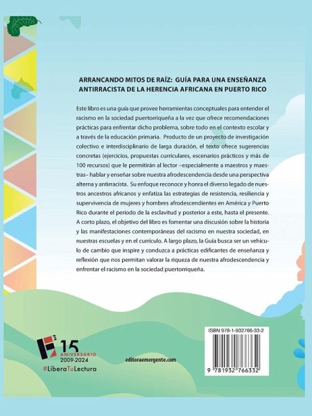 Arrancando mitos de raíz: guía para una enseñanza antirracista de la herencia africana en Puerto Rico es una guía que provee herramientas conceptuales para entender el racismo en la sociedad puertorriqueña a la vez que ofrece recomendaciones prácticas para enfrentar dicho problema, sobre todo en el contexto escolar y a través de la educación primaria. Producto de un proyecto de investigación colectivo e interdisciplinario de larga duración, el texto ofrece sugerencias concretas (ejercicios, propuestas curriculares, escenarios prácticos y más de 100 recursos) que le permitirán al lector -especialmente a maestros y maestras- hablar y enseñar sobre nuestra afrodescendencia desde una perspectiva alterna y antirracista.