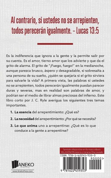 ...al contrario, si ustedes no se arrepienten, todos perecerán igualmente. Lucas 13:5 Es la indiferencia que ignora a la gente y la permite salir por su cuenta. Es el amor, tierno amor que los advierte y que da el grito de alarma. El grito de "¡Fuego, fuego!" en la medianoche, aunque parezca brusco, áspero y desagradable, si sobresalta a una persona de su sueño, ¿quién se quejaría si el grito sirviera para salvarle la vida? A primera vista, las palabras si ustedes no se arrepienten, todos perecerán igualmente puedan parecer duras y severas, mas en realidad son palabras de amor, y podrían ser el medio de librar almas preciosas del infierno. Este libro corto por J. C. Ryle averigua los siguientes tres temas importantes. 1.La esencia del arrepentimiento: ¿Qué es? 2.La necesidad del arrepentimiento: ¿Por qué se necesita? 3.Lo que anima uno a arrepentirse: ¿Qué es lo que conduce a la gente a arrepentirse?