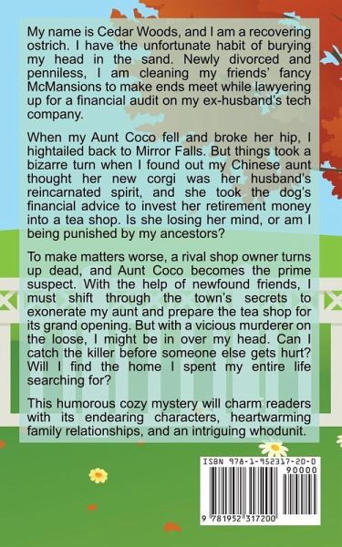 My name is Cedar Woods, and I am a recovering ostrich. I have the unfortunate habit of burying my head in the sand. Newly divorced and penniless, I am cleaning my friends' fancy McMansions to make ends meet while lawyering up for a financial audit on my ex-husband's tech company. When my Aunt Coco fell and broke her hip, I hightailed back to Mirror Falls. But things took a bizarre turn when I found out my Chinese aunt thought her new corgi was her husband's reincarnated spirit, and she took the dog's financial advice to invest her retirement money into a tea shop. Is she losing her mind, or am I being punished by my ancestors? To make matters worse, a rival shop owner turns up dead, and Aunt Coco becomes the prime suspect. With the help of newfound friends, I must shift through the town's secrets to exonerate my aunt and prepare the tea shop for its grand opening. But with a vicious murderer on the loose, I might be in over my head. Can I catch the killer before someone else gets hurt? Will I find the home I spent my entire life searching for? This humorous cozy mystery will charm readers with its endearing characters, heartwarming family relationships, and an intriguing whodunit.