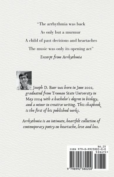 Arrhythmia is an intimate, heartfelt collection of contemporary poetry on heartache, love and loss. This chapbook is the first of Joe's published works and includes many pieces developed during his time on campus at Truman State University.