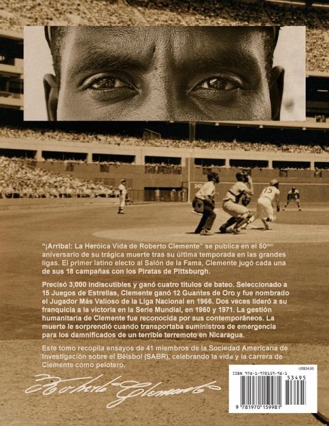 Con fotos del Museo Clemente. "¡Arriba!: La Heróica Vida de Roberto Clemente" se publica en el 50mo aniversario de su trágica muerte tras su última temporada en las grandes ligas. El primer latino electo al Salón de la Fama, Clemente jugó cada una de sus 18 campañas con los Piratas de Pittsburgh. Precisó 3,000 indiscutibles y ganó cuatro títulos de bateo. Seleccionado a 15 Juegos de Estrellas, Clemente ganó 12 Guantes de Oro y fue nombrado el Jugador Más Valioso de la Liga Nacional en 1966. Dos veces lideró a su franquicia a la victoria en la Serie Mundial, en 1960 y 1971. La gestión humanitaria de Clemente fue reconocida por sus contemporáneos. La muerte le sorprendió cuando transportaba suministros de emergencia para los damnificados de un terrible terremoto en Nicaragua. Este tomo recopila ensayos de 41 miembros de la Sociedad Americana de Investigación sobre el Béisbol (SABR), celebrando la vida y la carrera de Clemente como pelotero.