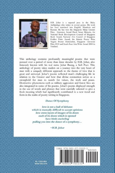 This anthology contains profoundly meaningful poems that were penned over a period of more than three decades by H.B. Johar, also famously known with his real name Johar Buang, a Sufi Poet. This anthology of poetry takes readers on a journey into the very heart of man with a uniquely different approach to the theme of love that is great and universal. Johar's poems reflected man's challenging life in relation to the Creator and how that divine connection serves as a stronghold for man to search for values, the truth and peace. Destructive phenomena such as military aggression and forest fires are also integrated in some of his poems. Johar's poems displayed strength in the use of words and phrases that were carefully selected to give a fresh meaning which had significantly contributed to a new trend and form in the realm of poetry writing in Singapore.