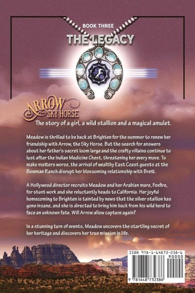 The story of a girl, a wild stallion and a magical amulet. Meadow is thrilled to be back in Brighton for the summer to renew her friendship with Arrow, the Sky Horse. But the search for answers about her father's secret loom large and the crafty villains continue to lust after the Indian Medicine Chest, threatening her every move. To make matters worse, the arrival of wealthy East Coast guests at the Bowman Ranch disrupt her blossoming relationship with Brett. A Hollywood director recruits Meadow and her Arabian Mare, Foxfire, for stunt work and she reluctantly heads to California. Her joyful homecoming to Brighton is tainted by news that the silver stallion has gone insane, and she is directed to bring him back from his wild herd to face an unknown fate. Will Arrow allow capture again? In a stunning turn of events, Meadow uncovers the startling secret of her heritage and discovers her true mission in life.