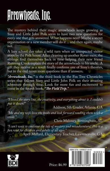 "Arrowheads, Inc." is the third book in the Fox Tree Chronicles series that follows Sissy and Little John Polk on their quest to learn the secret behind their magic arrowheads. The books are great reading for children in grades 1-6, and are "Kid Tested!"