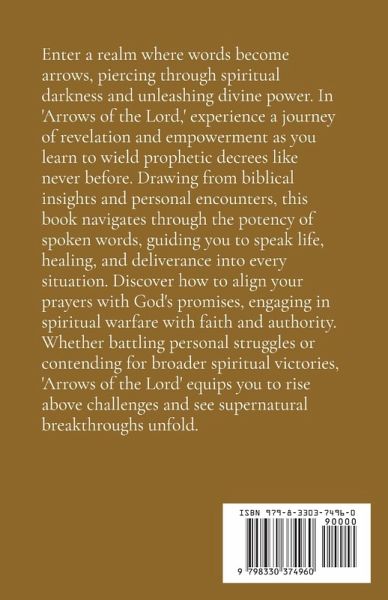 Enter a realm where words become arrows, piercing through spiritual darkness and unleashing divine power. In 'Arrows of the Lord,' experience a journey of revelation and empowerment as you learn to wield prophetic decrees like never before. Drawing from biblical insights and personal encounters, this book navigates through the potency of spoken words, guiding you to speak life, healing, and deliverance into every situation. Discover how to align your prayers with God's promises, engaging in spiritual warfare with faith and authority. Whether battling personal struggles or contending for broader spiritual victories, 'Arrows of the Lord' equips you to rise above challenges and see supernatural breakthroughs unfold.