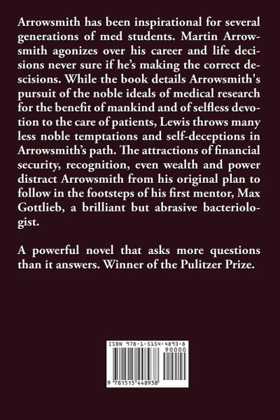 Arrowsmith has been inspirational for several generations of med students. Martin Arrowsmith agonizes over his career and life decisions never sure if he's making the correct decisions. While the book details Arrowsmith's pursuit of the noble ideals of medical research for the benefit of mankind and of selfless devotion to the care of patients, Lewis throws many less noble temptations and self-deceptions in Arrowsmith's path. The attractions of financial security, recognition, even wealth and power distract Arrowsmith from his original plan to follow in the footsteps of his first mentor, Max…mehr