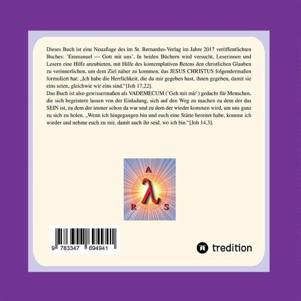 In diesem Buch wird versucht Leserinnen und Lesern ein Hilfe anzubieten, mit Hilfe des kontemplativen Betens den christlichen Glauben zu verinnerlichen, um dem Ziel näher zu kommen, das JESUS CHRISTUS folgendermaßen formuliert hat: "Ich habe die Herrlichkeit, die du mir gegeben hast, ihnen gegeben, damit sie eins seien, gleichwie wir eins sind." [Joh 17,22]. Das Buch ist also gewissermaßen als VADEMECUM ('Geh mit mir') gedacht für Menschen, die sich begeistern lassen von der Einladung, sich auf den Weg zu machen zu dem der das SEIN ist, zu dem der immer schon da war und zu dem der wieder kommen wird, um uns ganz zu sich zu holen. "Wenn ich hingegangen bin und euch eine Stätte bereitet habe, komme ich wieder und nehme euch zu mir, damit auch ihr seid, wo ich bin." [Joh 14,3].