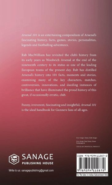Arsenal 101 is an entertaining compendium of Arsenal's fascinating history, facts, games, stories, personalities, legends and footballing adventures. Rab MacWilliam has revisited the club's history from its early years as Woolwich Arsenal at the end of the nineteenth century to its status as one of the leading European teams of the present day. Rab has distilled Arsenal's history into 101 facts, moments and stories, examining many of the key characters, matches, controversies, innovations, and dazzling instances of brilliance that have illuminated the proud history of this great, if occasionally erratic, club. Funny, irreverent, fascinating and insightful, Arsenal 101 is the ideal handbook for Gunners fans of all ages.
