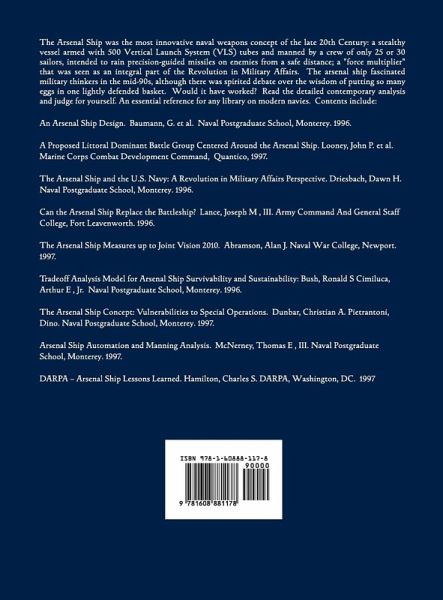 The Arsenal Ship was the most innovative naval weapons concept of the late 20th Century: a stealthy vessel armed with 500 Vertical Launch System (VLS) tubes and manned by a crew of only 25 or 30 sailors, intended to rain precision-guided missiles on enemies from a safe distance; a "force multiplier" that was seen as an integral part of the Revolution in Military Affairs. The arsenal ship fascinated military thinkers in the mid-90s, although there was spirited debate over the wisdom of putting so many eggs in one lightly defended basket. Would it have worked? Read the detailed contemporary analysis and judge for yourself. An essential reference for any library on modern navies. Contents include: An Arsenal Ship Design. Baumann, G. et al. Naval Postgraduate School, Monterey. 1996. A Proposed Littoral Dominant Battle Group Centered Around the Arsenal Ship. Looney, John P. et al. Marine Corps Combat Development Command, Quantico, 1997. The Arsenal Ship and the U.S. Navy: A Revolution in Military Affairs Perspective. Driesbach, Dawn H. Naval Postgraduate School, Monterey. 1996. Can the Arsenal Ship Replace the Battleship? Lance, Joseph M , III. Army Command And General Staff College, Fort Leavenworth. 1996. The Arsenal Ship Measures up to Joint Vision 2010. Abramson, Alan J. Naval War College, Newport. 1997. Tradeoff Analysis Model for Arsenal Ship Survivability and Sustainability: Bush, Ronald S Cimiluca, Arthur E , Jr. Naval Postgraduate School, Monterey. 1996. The Arsenal Ship Concept: Vulnerabilities to Special Operations. Dunbar, Christian A. Pietrantoni, Dino. Naval Postgraduate School, Monterey. 1997. Arsenal Ship Automation and Manning Analysis. McNerney, Thomas E , III. Naval Postgraduate School, Monterey. 1997. DARPA ¿ Arsenal Ship Lessons Learned. Hamilton, Charles S. DARPA, Washington, DC. 1997.