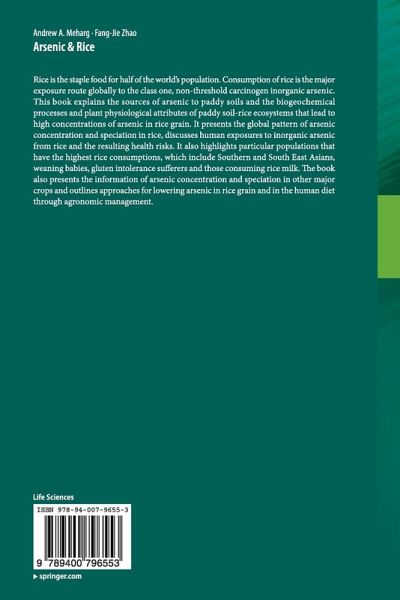Acknowledgements.- Abbreviations.- Chapter 1: Introduction.- 1.1 Arsenic exposure from rice.- 1.2 Historical context.- 1.3 Biogeochemistry of paddy soils.- 1.4 Plant Physiology.- 1.5 Summary.-References.- Chapter 2: Arsenic in rice grain.- 2.1 Introduction.- 2.2 Quantification of arsenic in rice grain.- 2.3 Arsenic speciation in rice grain.- 2.4 Total grain arsenic.- 2.5 Rice products.- References.- Chapter 3: Risk from arsenic in rice grain.- 3.1 Rice consumption.- 3.2 Studies on the total intake of inorganic arsenic.- 3.3 Problems with ignoring rice when looking at dietary intake of arsenic.- 3.4 The effects of cooking rice on its arsenic content.- 3.5 Human bioavailability of arsenic in rice.- 3.6 Risk assessment from arsenic in rice.- 3.7 Food arsenic standards.- 3.8 Limiting arsenic exposure to rice.- References.- Chapter 4: Sources and losses of arsenic to paddy fields.- 4.1 Introduction.- 4.2 Sources of arsenic to paddy ecosystems.- 4.3 Paddy field arsenic cycling in a wider hydrological context.- References.- Chapter 5: Biogeochemistry of arsenic in paddy environments.- 5.1 Overview of the biogeochemistry of paddy soil.- 5.2 Arsenic transformations in paddy soil.- 5.3 Impact of groundwater irrigation on arsenic dynamics in paddy fields.- References.- Chapter 6: The physiology of arsenic in rice.- 6.1 Introduction.- 6.2 Mechanisms of arsenic uptake by roots.- 6.3 Transformation of arsenic species in plant.- 6.4 Arsenic sequestration in plant.- 6.5 Long-distance transport and unloading of arsenic to rice grain.- 6.6 Arsenic toxicity and straighthead disease.- References.- Chapter 7: Strategies for producing low arsenic rice.- 7.1 Introduction.- 7.2 Paddy field water management.- 7.3 Cultivar selection and breeding low arsenic rice.- 7.4 Fertilization and soil amendments.- References.- Chapter 8: Arsenic in other crops.- 8.1 Introduction.- 8.2 Wheat.- 8.3 Maize.- 8.4 Potato.- 8.5 Pulses.- 8.6 Vegetables.- 8.7 Fruits.- References.