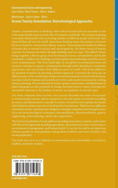 The book comprises three sections. First section describes the routes of exposure to environmental arsenic and its transport in soil and aquatic ecosystems including its source and distribution in specific locations. Second section explains the health risks linked to arsenic exposure in food and the environment. Third section addresses sustainable arsenic contamination mitigation strategies using the potential applications of recent biotechnological techniques, bioremediation, phytoremediation, genetic engineering, nanotechnology, and in silico approaches.