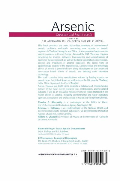The Society of Environmental Geochemistry and Health (SEGH) Second International Conference on Arsenic Exposure and Health Effects was held June 12-14, 1995 in San Diego, California. The conference was at tended by 152 people who heard 41 presentations on all aspects of arsenic research. The speakers represented 14 countries. Approximately 40 of the participants and speakers were from countries other than the US. The participants represented government, academia, industry and the interested public. The sponsorship ofthe conference is a good indicationofthe wide spread interest in the subject…mehr