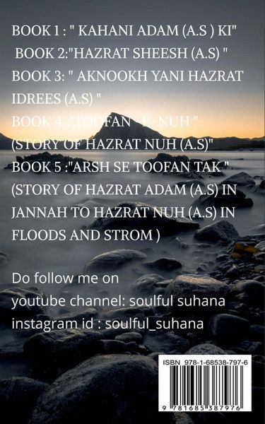 BOOK 1 : "" KAHANI ADAM (A.S ) KI"" BOOK 2:""HAZRAT SHEESH (A.S) "" BOOK 3: "" AKNOOKH YANI HAZRAT IDREES (A.S) "" BOOK 4 :""TOOFAN -E-NUH "" (STORY OF HAZRAT NUH (A.S)"" BOOK 5 :""ARSH SE TOOFAN TAK "" (STORY OF HAZRAT ADAM (A.S) IN JANNAH TO HAZRAT NUH (A.S) IN FLOODS AND STROM ) ALL BOOKS ARE AVAILABLE ON AMAZON, FLIKART, SANPDEAL contact me on instagram to order in bulk and to get great discounts on it