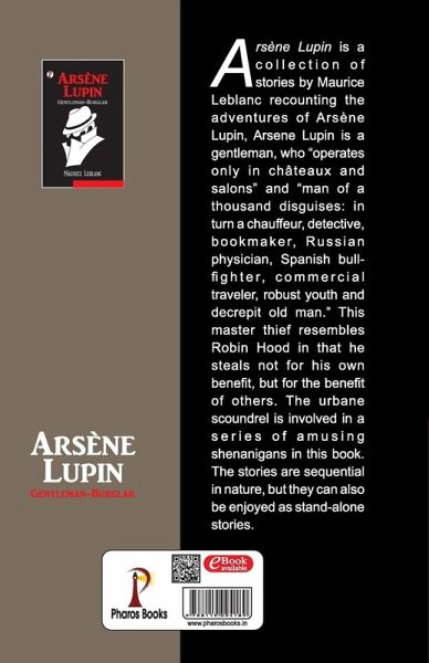 Arsène Lupin is a collection of stories by Maurice Leblanc recounting the adventures of Arsène Lupin, Arsene Lupin is a gentleman, who "operates only in châteaux and salons" and "man of a thousand disguises: in turn a chauffeur, detective, bookmaker, Russian physician, Spanish bull-fighter, commercial traveler, robust youth and decrepit old man." This master thief resembles Robin Hood in that he steals not for his own benefit, but for the benefit of others. The urbane scoundrel is involved in a series of amusing shenanigans in this book. The stories are sequential in nature, but they can also be enjoyed as stand-alone stories.
