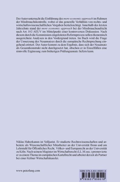 Der Autor untersucht die Einführung des more economic approach im Rahmen der Missbrauchskontrolle, wobei er das generelle Verhältnis von rechts- und wirtschaftswissenschaftlichen Vorgaben berücksichtigt. Innerhalb des letzten Jahrzehnts stand der more economic approach bei der Missbrauchsaufsicht nach Art. 102 AEUV im Mittelpunkt einer kontroversen Diskussion. Nach diesem durch die Kommission eingeleiteten Reformprozess sollen ökonomisch ausgerichtete Analysen in den Vordergrund treten. Im Buch wird die Frage der Umsetzung des Neuansatzes durch die europäische Rechtsprechung eingehend erörtert. Der Autor kommt zu dem Ergebnis, dass sich der Neuansatz als Gesamtkonstrukt nicht durchgesetzt hat, obschon er in Einzelfällen eine sinnvolle Ergänzung zum bisherigen Prüfungsansatz liefern kann.