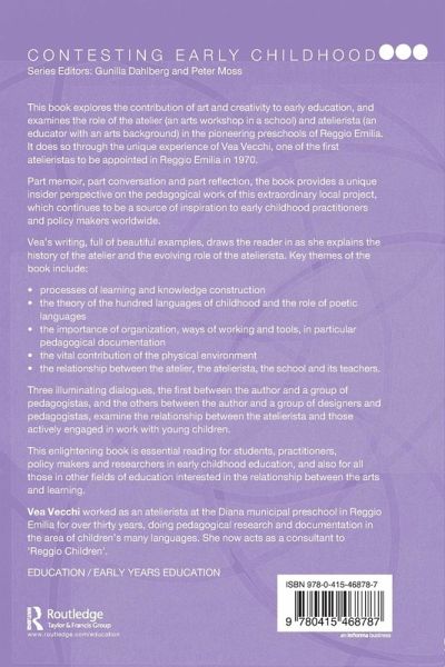 This book explores the contribution of and art and creativity to early education, and examines the role of the atelier (an arts workshop in a school) and atelierista (an educator with an arts background) in the pioneering pre-schools of Reggio Emilia. It does so through the unique experience of Vea Vecchi, one of the first atelieristas to be appointed in Reggio Emilia in 1970.