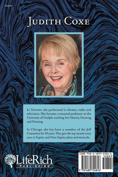 Judith Coxe, M.A., Art History, University of Toronto Judith Coxe was recognized for her talent at an early age: her brother was six when he watched her perform on television, just twelve. Entering high school, she was invited to join a group of young artists, sponsored by the Massey family of Toronto for immersive training. They worked year-round and spent summers performing two plays each day. She remembers the camaraderie, enthusiasm, fun! It was not long before she was a sought-after leading lady, albeit still a very young lady. She was an actress, on television and film and most of all on the stage, from the age of 14. At the University of Toronto, she performed in stage productions twice a year, plus summer stock; and she hosted her own radio program - all while she earned a Masters degree in Art History. Moving to Guelph, as a young wife and mother, she became a tenured professor, teaching Art and Art History at the University of Guelph. She remembered fondly, the joy of encouraging young talents, and the time for her own explorations in art. An accomplished artist, by the time she was in her mid-20's, Judith Coxe's paintings in water color, acrylic and mixed media were exhibited and warmly reviewed in exhibitions in Canada and the US. Another family move in 1987 brought her to New York, where she and her husband Don could indulge their love of theatre. Their home, a pre-revolutionary farm in Greenwich, gave her a new avenue for her artistry: inspired by the near-by arboretum, Judy plunged into gardening. She painted in her studio over the barn, and showed her work in New York. Theatre remained significant throughout her life: after moving to Chicago in the 90's, she served 25 years as a theatre critic for the Jeff Awards in Chicago, reviewing Equity and Non-equity performances-and still punctuated her time with theatre trips to London and New York. Blessed with talent, and advanced through hard work, Judith Coxe led an extraordinary life, in which Art and Poetry were constants. "Inspiration spins among the stars to the rhythmic pounding of the heart." Judith Coxe died after a difficult battle with leukemia on July 27, 2020. This book was completed from her hospital bed just weeks before, with the same determination and devotion to her craft as in all things.