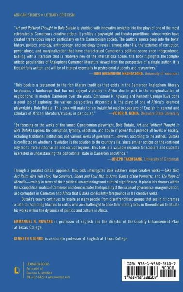 The book Art and Political Thought in Bole Butake, through a pluralist critical approach, interrogates Butake's major creative works-Lake God, And Palm Wine Will Flow, The Survivors, Shoes and Four Men in Arms, Dance of the Vampires and The Rape of Michelle -mainly in terms of their political underpinnings and cultural signification. The intention is to place his drama within the socio-political matrix of Cameroon and demonstrate the topicality of the issues of governance, marginalization, and corruption in Cameroon or Africa that Butake consistently foregrounds in his creative works. The study opens with an overview of the historical and social milieu that feeds Butake's imagination and the introduction is followed by an interview of the playwright in which he explains his mission as a writer. The next two chapters appraise the political symbolism of Butake's plays and chapter five undertakes a comparison of the colonial legacy and the culture of corruption in Butake's Lake God and The Rape of Michelle. Women in Butake's imaginative universe play a non-negligible role in change. They are portrayed as political and social activists in their challenge to autocratic rule. This is the leitmotif of chapter six, which highlights the contribution of women towards political change in Cameroon. In chapters seven and eight, the focus is on articulating the cultural signification of Butake's plays in terms of political change. Concomitantly, these chapters also demonstrate Butake's seamless incorporation of elements of oral literature in his drama, as he interpolates proverbs, divinations and other elements of orality in his work. Chapter nine of the book points out how Butake foregrounds the character traits of his protagonists against the backdrop of traditional Noni religion as well as Christianity. Thus, the bigotry and belligerence of both the Fon and Father Leo in Lake God, for example, are projected through a supernatural frame. The conclusion appraises the contemporaneity of Butake's drama. His oeuvre continues to inspire so many people: from disenfranchised groups that see in his drama a path to reclaiming liberties and to critics who are challenged to hone their literary tools in the endeavor to situate his works within the dynamics of politics and culture in Africa.