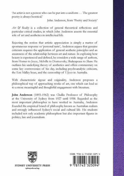 Art and Reality is a collection of general theoretical reflections and particular critical studies, in which John Anderson asserts the essential role of art and aesthetics in intellectual life. Rejecting the notion that artistic appreciation is simply a matter of spontaneous response or 'personal taste', Anderson argues that genuine criticism requires the application of general aesthetic principles and an awareness of the relationship between art and nature. In exploring how beauty is experienced and defined, he considers a wide range of authors, from Homer to Joyce, Melville to Dostoevsky, Shakespeare to Shaw. He outlines his underlying theory of aesthetics and offers commentary on some key controversies of his day, including psychoanalytic criticism, the Ern Malley hoax, and the censorship of Ulysses in Australia. With characteristic rigor and originality, Anderson proposes a philosophical way of approaching works of art, one which can lead us to a more meaningful and thoughtful engagement with literature.