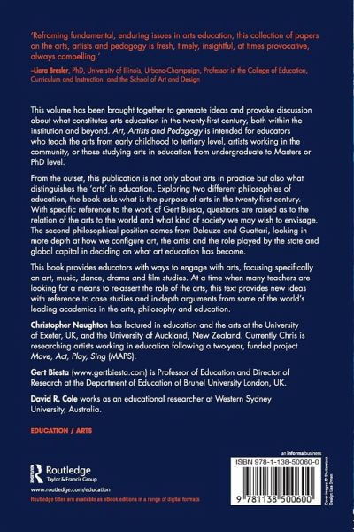 "The book Art, Artists and Pedagogy is a book that highlights philosophical perspectives on art in education. It is a book that references Gert Biesta's educational philosophy, but in dialogue with Deleuze and Guattari's immanent philosophy... Biesta's powerful introductory chapter echoes throughout all 15 chapters."