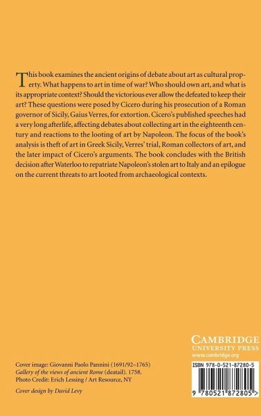 This book examines the ancient origins of debate about art as cultural property. What happens to art in time of war? Who should own art, and what is its appropriate context? Should the victorious ever allow the defeated to keep their art? These questions were posed by Cicero during his prosecution of a Roman governor of Sicily, Gaius Verres, for extortion. Cicero's published speeches had a very long afterlife, affecting debates about collecting art in the eighteenth century and reactions to the looting of art by Napoleon. The focus of the book's analysis is theft of art in Greek Sicily, Verres' trial, Roman collectors of art, and the later impact of Cicero's arguments. The book concludes with the British decision after Waterloo to repatriate Napoleon's stolen art to Italy and an epilogue on the current threats to art looted from archaeological contexts.