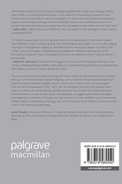 This book examines postmodern theology and how it relates to the cinematic style of Robert Bresson, Carl Theodor Dreyer, Ingmar Bergman, and Luis Buñuel. Ponder demonstrates how these filmmakers forefront religious issues in their use of mise en scène. He investigates both the technical qualities of film "flesh" and its theological features. The chapters show how art cinema uses sound, editing, lighting, and close-ups in ways that critique doctrine's authoritarianism, as well as philosophy's individualism, to suggest postmodern theologies that emphasize community. Through this book we learn how the cinematic style of modernist auteurs relates to postmodern theology and how the industry of art cinema constructs certain kinds of film-watching subjectivity.