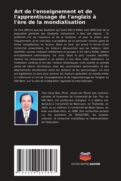 Ce livre affirme que les étudiants qui lisent Harry Potter sont différents de la population générale des étudiants vietnamiens à bien des égards : ils préfèrent lire de l'aventure et de la fantaisie, et pour le plaisir plus fréquemment, et ils sont plus susceptibles de se percevoir comme ayant de fortes compétences en lecture. Dans ce livre, qui prend la forme d'une recherche universitaire, les lecteurs découvriront que les facteurs réels identifiés comme motivant initialement ce groupe à lire Harry Potter étaient principalement extrinsèques, les amis étant le plus souvent identifiés comme les encourageant à se joindre à eux dans cette expérience. La motivation continue à lire des romans fantastiques s'est avérée en grande partie de nature intrinsèque, avec des associations personnelles et des attachements émotionnels entre les lecteurs et les personnages. Ce livre est également un pont pour amener les lecteurs potentiels du monde entier à s'intéresser à l'art de l'enseignement et de l'apprentissage de l'anglais au Viêt Nam, sur la voie de l'intégration régionale et internationale.