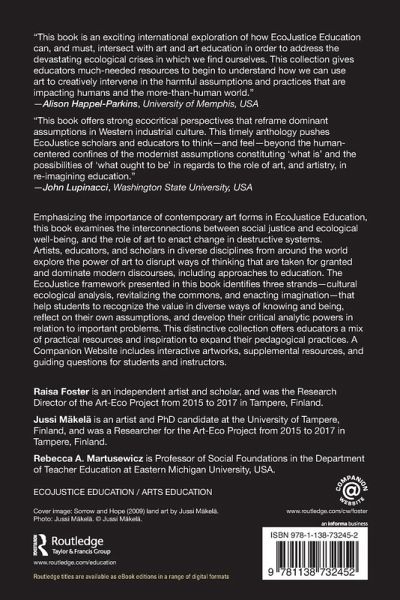 1. Introduction: Contemporary Art as Critical, Revitalizing, and Imaginative Practice Toward Sustainable Communities 2. For the Most Important Parts of You: A Story About Science 3. Recognizing Mutuality: The More-Than-Human World and Me 4. The Experience of the Uncanny as a Challenge for Teaching Ecological Awareness 5. Letters from Love's Great Room: Fiction as Cultural Ecological Analysis and Pedagogy of Responsibility 6. Art Is That Which Takes Something Real and Makes It More Real Than It Was Before 7. Poetry and EcoJustice in a Kenyan Refugee Settlement 8. The Uncle Vanya Project: Performance, Landscape, and Time 9. For the Love of the Forest: Walking, Mapping, and Making Textile Art 10. Finding My Wound, Bandaging My Knife: Stimulating Inner Transformation through Art 11. Building Ecological Ontologies: EcoJustice Education Becoming with(in) Art-science Activisms 12. Apptivism, Farming, and EcoJustice Art Education 13. Creativity as Intrinsic Ecological Consciousness 14. Love in the Commons: Eros, Eco-Ethical Education, and a Poetics of Place