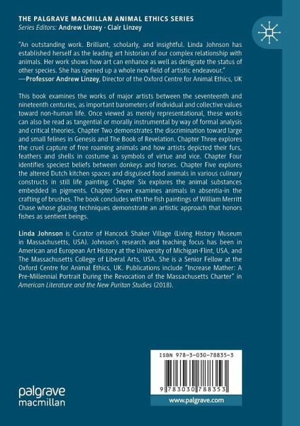 This book examines the works of major artists between the seventeenth and nineteenth centuries, as important barometers of individual and collective values toward non-human life. Once viewed as merely representational, these works can also be read as tangential or morally instrumental by way of formal analysis and critical theories. Chapter Two demonstrates the discrimination toward large and small felines in Genesis and The Book of Revelation. Chapter Three explores the cruel capture of free roaming animals and how artists depicted their furs, feathers and shells in costume as symbols of virtue and vice. Chapter Four identifies speciest beliefs between donkeys and horses. Chapter Five explores the altered Dutch kitchen spaces and disguised food animals in various culinary constructs in still life painting. Chapter Six explores the animal substances embedded in pigments. Chapter Seven examines animals in absentia-in the crafting of brushes. The book concludes with the fish paintings ofWilliam Merritt Chase whose glazing techniques demonstrate an artistic approach that honors fishes as sentient beings.