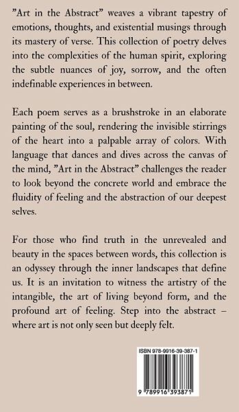 "Art in the Abstract" weaves a vibrant tapestry of emotions, thoughts, and existential musings through its mastery of verse. This collection of poetry delves into the complexities of the human spirit, exploring the subtle nuances of joy, sorrow, and the often indefinable experiences in between.Each poem serves as a brushstroke in an elaborate painting of the soul, rendering the invisible stirrings of the heart into a palpable array of colors. With language that dances and dives across the canvas of the mind, "Art in the Abstract" challenges the reader to look beyond the concrete world and embrace the fluidity of feeling and the abstraction of our deepest selves.For those who find truth in the unrevealed and beauty in the spaces between words, this collection is an odyssey through the inner landscapes that define us. It is an invitation to witness the artistry of the intangible, the art of living beyond form, and the profound art of feeling. Step into the abstract - where art is not only seen but deeply felt. Copyright © 2023 Book Fairy Publishing