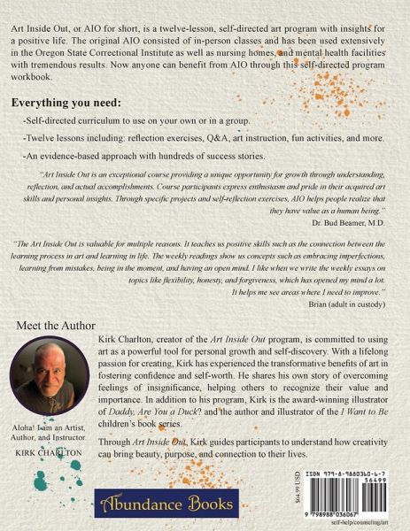 Art Inside Out, or AIO for short, is a twelve-lesson, self-directed art program with insights for a positive life. The original AIO consisted of in-person classes and has been used extensively in the Oregon State Correctional Institute as well as nursing homes, and mental health facilities with tremendous results. Now anyone can benefit from AIO through this self-directed program workbook. Everything you need: · Self-directed curriculum to use on your own or in a group. · Twelve lessons consisting of reflection exercises, Q&A, art instruction, fun activities, and more. · An evidence-based approach with hundreds of success stories.