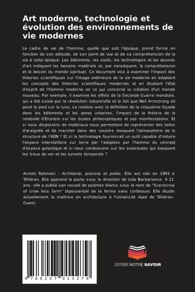 Le cadre de vie de l'homme, quelle que soit l'époque, prend forme en fonction de son attitude, de son point de vue et de sa compréhension de la vie à cette époque. Les bâtiments, les outils, les technologies et les oeuvres d'art indiquent les besoins matériels et, par conséquent, la compréhension et le besoin du monde spirituel. Ce document vise à examiner l'impact des théories scientifiques sur l'image extérieure de la vie moderne en adoptant les concepts des théories scientifiques modernes et en étudiant l'état d'esprit de l'homme moderne en ce qui concerne la création d'un monde nouveau. Par exemple, il examine les effets de la Seconde Guerre mondiale, qui a été suivie par la révolution industrielle et le fait que Neil Armstrong ait posé le pied sur la lune, sa relation avec la définition de la cinquième façade dans les bâtiments et les zones urbaines, l'impact de la théorie de la relativité d'Einstein sur les écoles philosophiques et ses manifestations. Et si nous disposions de matériaux nous permettant de représenter des toiles d'araignée et de marcher dans des couloirs évoquant l'atmosphère de la structure de l'ADN ? Et si la technologie fournissait un outil capable d'induire l'espace interstellaire sur terre par l'adoption par l'homme du concept d'espace galactique et si nous conduisions sur les autoroutes qui évoquent les trous de ver et les tunnels temporels ?