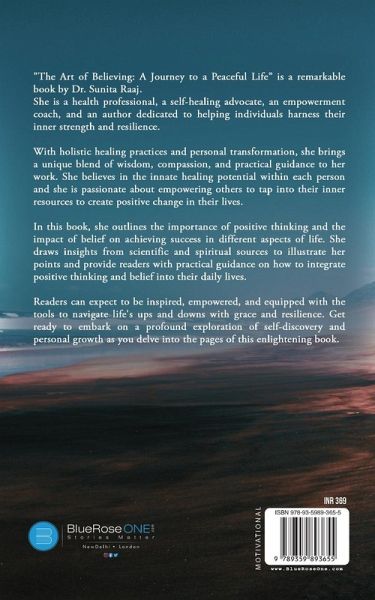 "The Art of Believing - A Journey to a Peaceful Life" by Dr. Sunita Raaj offers a transformative guide to harnessing inner strength and resilience. As a health professional and empowerment coach, she emphasizes holistic healing and personal transformation. Drawing from scientific and spiritual insights, she highlights the power of positive thinking and belief in achieving success. Readers will find practical guidance to integrate these principles into their lives, fostering grace and resilience amidst life's challenges. Through this enlightening book, Dr. Sunita Raaj inspires and empowers readers to embark on a profound journey of self-discovery and growth.