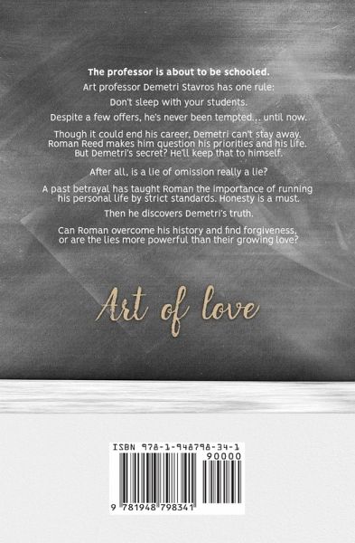 The professor is about to be schooled. Art professor Demetri Stavros has one rule: Don't sleep with your students. Despite a few offers, he's never been tempted... until now. Though it could end his career, Demetri can't stay away. Roman Reed makes him question his priorities and his life. But Demetri's secret? He'll keep that to himself. After all, is a lie of omission really a lie? A past betrayal has taught Roman the importance of running his personal life by strict standards. Honesty is a must. Then he discovers Demetri's truth. Can Roman overcome his history and find forgiveness, or are the lies more powerful than their growing love?